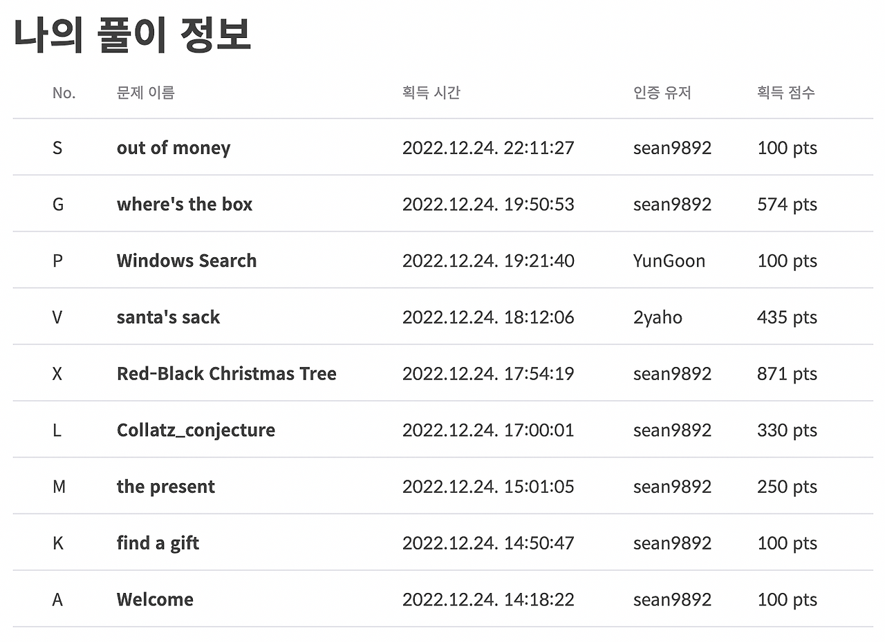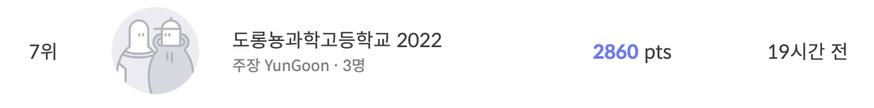 드림핵에서 주최한 2022 Christmas CTF에 도롱뇽과학고등학교 2022팀으로 참가하여 팀이 해결한 9문제 중 7문제를 해결하였고, 결과적으로 7위로 마무리하였다.